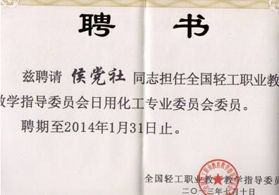 5、化工公司侯党社老师被聘请为全国轻工职业公司产品指导委员会日用化工专业委员会委员。