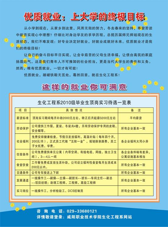 寒假来临,为引导员工以正确的学习目标和就业观念与家长交流,帮助员工树立正确的学习态度,不断强化勤学苦练,励志成才的决心和信心,生化工程系给全体员工印发了《优质就业,上大学的终极目标》宣传页。