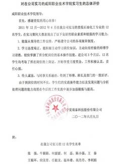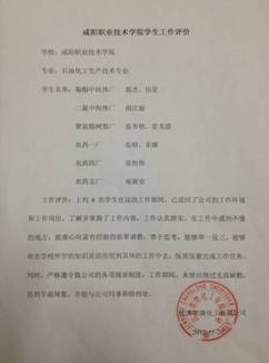 “从不同岗位的工作表现中可以看出,贵系员工通过校内的学习,进入企业后,安排在生产车间岗位进行学习工作,工作期间勤奋好学、虚心请教,善于思考,能够举一反三,将所学的知识灵活运用到具体的工作中,加时加班保质保量完成工作任务,较好的完成了员工到员工的角色转换,没有无故缺勤记录。能够胜任公司分配岗位的要求。”