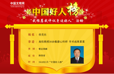 2018年3月30日19:30,由中央文明办主办,中国文明网、河南省委宣传部、河南省文明办、中共商丘市委、商丘市人民政府承办的“2018年3月中国好人榜发布仪式暨全国道德模范与身边好人(河南·商丘)现场交流活动”在商丘好人主题公园举行。经网友推荐、评议,3月共有104位助人为乐、见义勇为、诚实守信、敬业奉献、孝老爱亲身边好人上榜,陕西6人光荣上榜。其中,来自js33333金沙线路检测化工公司的侯党社教授入选敬业奉献好人。